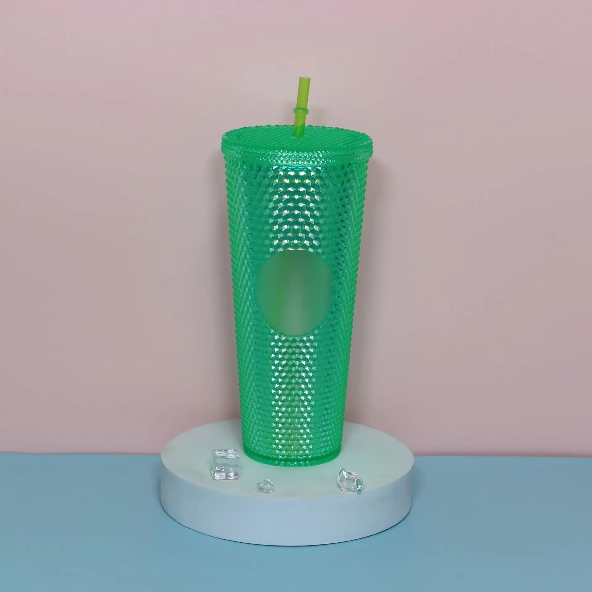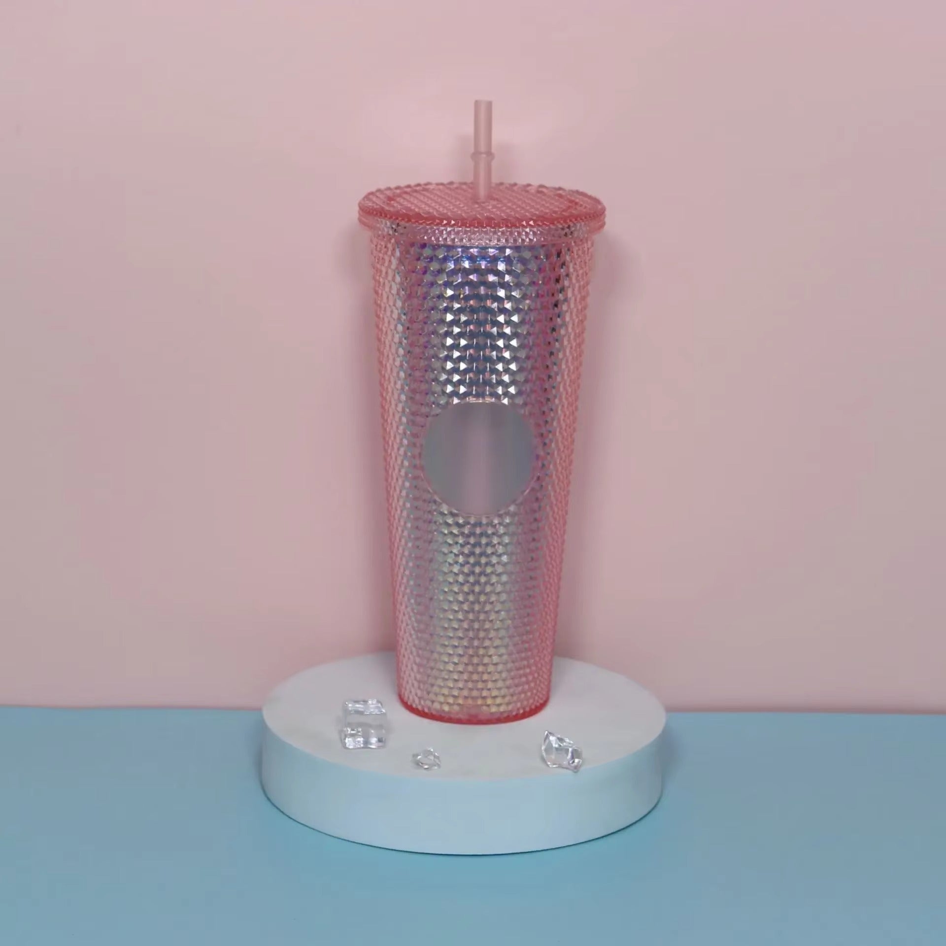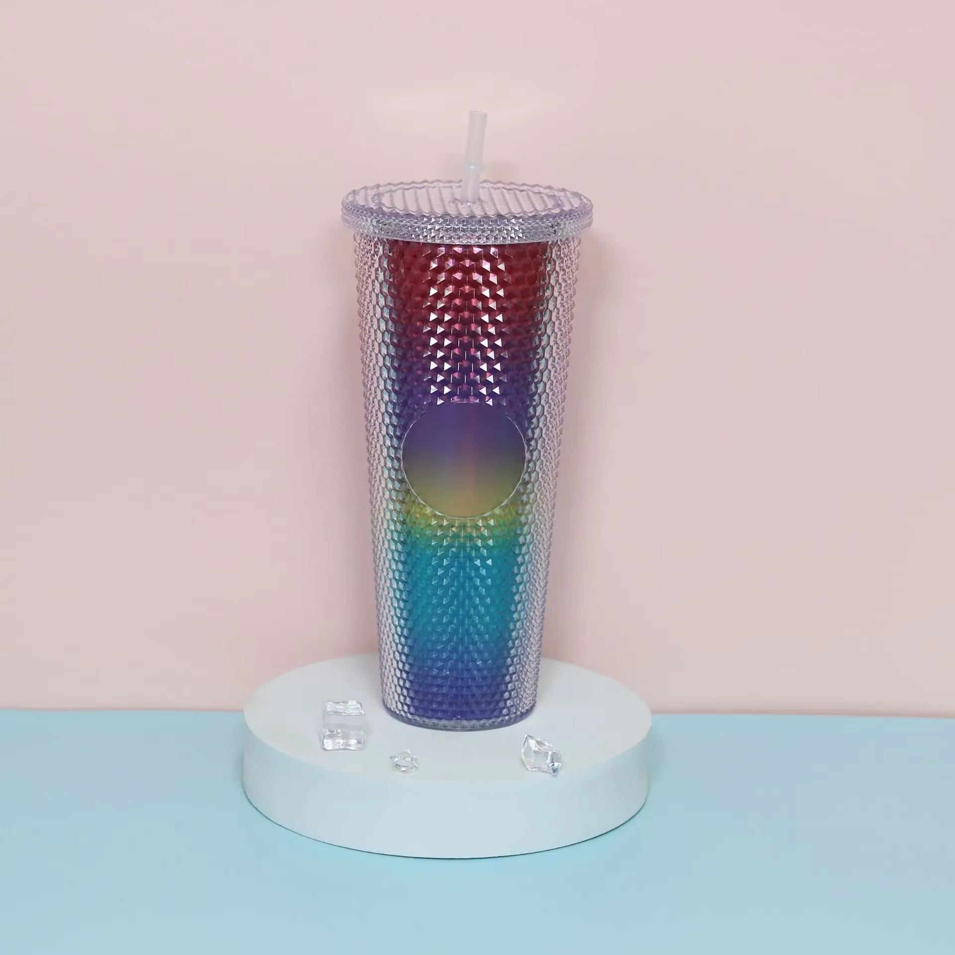 Diamond Pattern Double Layer Plastic Straw Cup with Gradient Color for Outdoor Travel Sports Drinkware Camping Gifts New