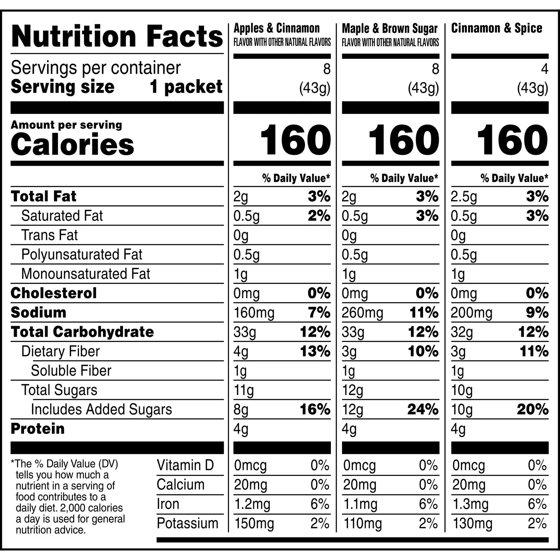 Maple & Brown Sugar: Whole Grain Rolled Oats, Sugar, Natural and Artificial Flavor, Salt, Calcium Carbonate, Guar Gum, Caramel Color, Niacinamide*, Reduced Iron, Vitamin A Palmitate, Pyridoxine Hydrochloride*, Riboflavin*, Thiamin Mononitrate*, Folic Acid*.Cinnamon & Spice: Whole Grain Rolled Oats, Sugar, Salt, Cinnamon and Other Spices, Calcium Carbonate, Guar Gum, Caramel Color, Niacinamide*, Reduced Iron, Vitamin A Palmitate, Pyridoxine Hydrochloride*, Riboflavin*, Thiamin Mononitrate*, Folic Acid*.Apples & Cinnamon: Whole Grain Rolled Oats, Sugar, Dehydrated Apples (Treated with Sodium Sulfite to Promote Color Retention), Natural and Artificial Flavor, Salt, Cinnamon, Calcium Carbonate, Citric Acid, Guar Gum, Malic Acid, Niacinamide*, Reduced Iron, Vitamin A Palmitate, Pyridoxine Hydrochloride*, Riboflavin*, Thiamin Mononitrate*, Folic Acid*, Caramel Color. One of the B Vitamins.