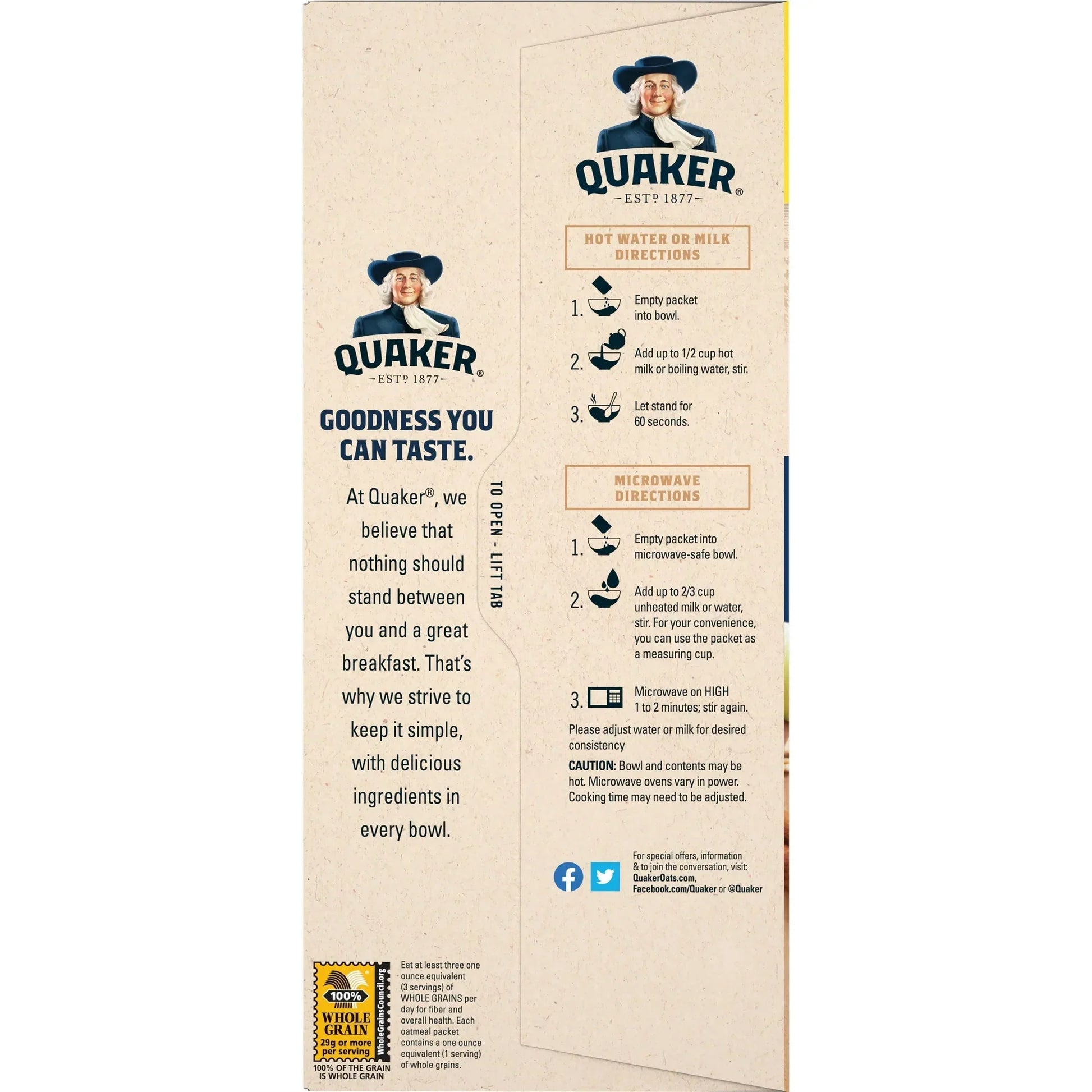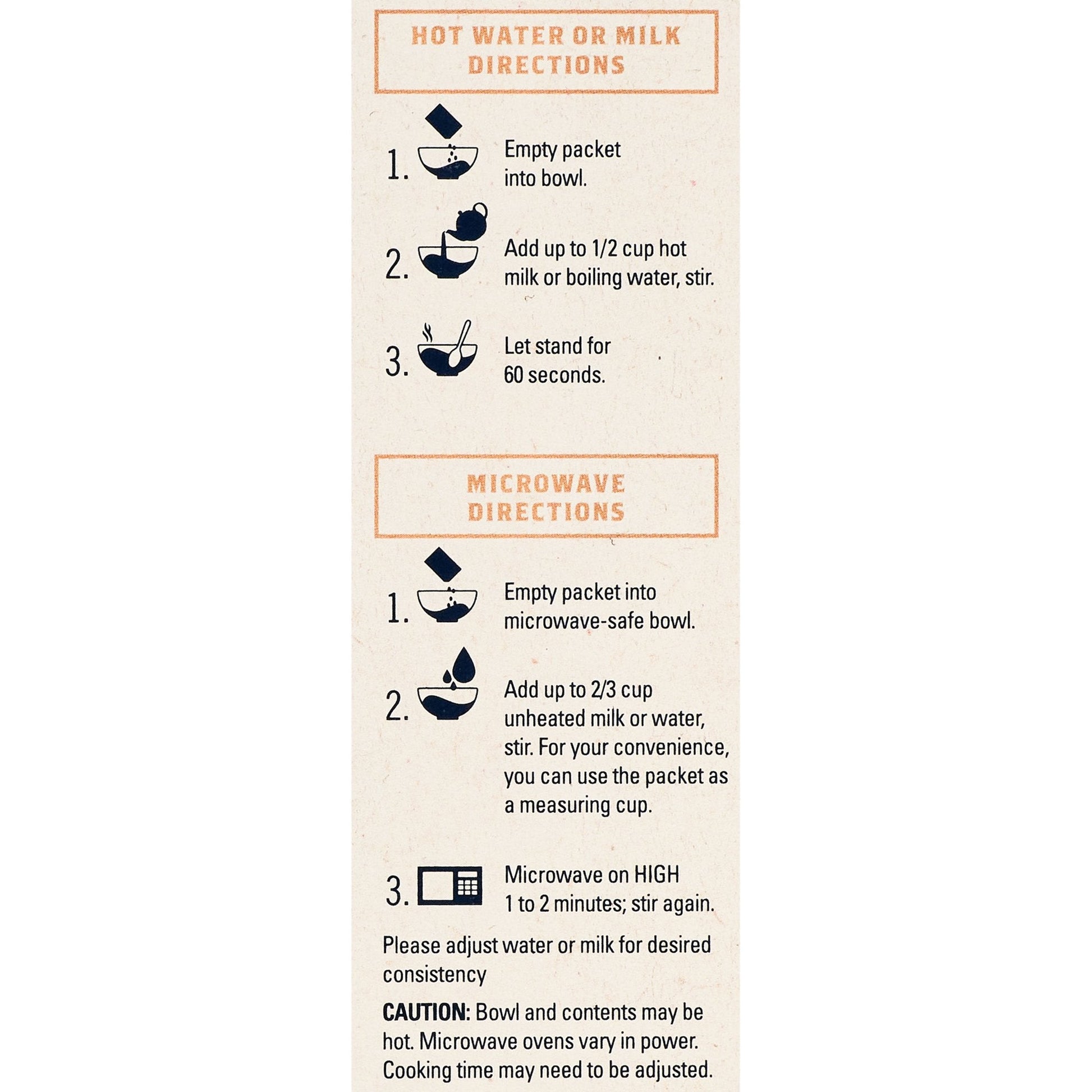 Hot Water or Milk Directions1. Empty packet into bowl.2. Add up to �� cup hot milk or boiling water, stir.3. Let stand for 60 seconds. Microwave Directions1. Empty packet into microwave���safe bowl.2. Add up to 2/3 cup unheated milk or water; stir.For your convenience, you can use the packet as a measuring cup.3. Microwave on high 1 to 2 minutes; stir again.